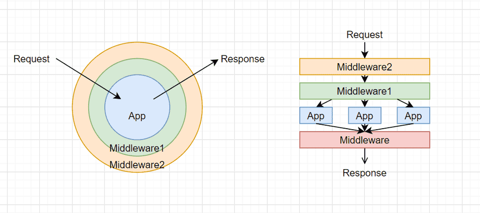 这两个图看起来是不是有点吓人,切面模型其实还比较好理解,洋葱模型看起来就有点懵了,是不是有点像函数的嵌套调用 Middleware2(Middleware1(App()))