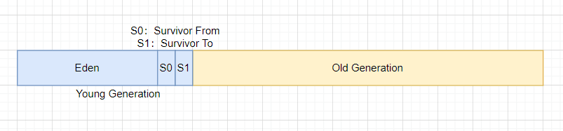 堆(Heap)时 JVM 垃圾收集器主要光顾的区域,也是 JVM 所管理内存中最大的一块。为了更好的管理堆,JVM 将堆分成了 2 个区域:新生代(Young Generation)、老生代(Old Generation),占比一般是 1:2。其中新生代又划分了 3 三个区域:Eden、Survivor From、Survivor To,占比一般为 8:1:1。