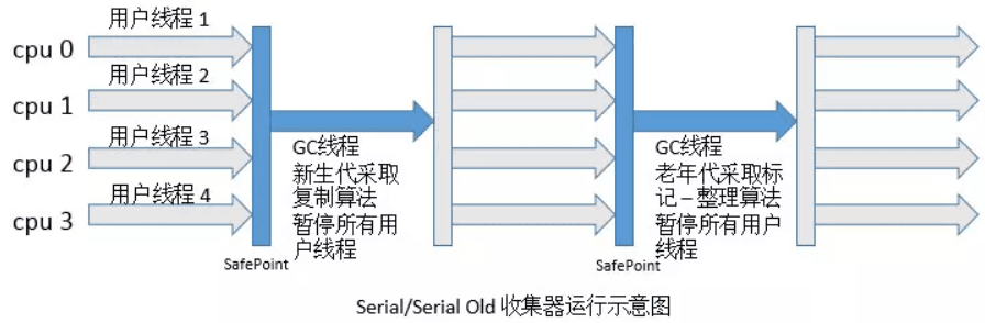 • Serial,用于新生代,采用标记-复制算法,回收时采用单线程的方式,进行垃圾收集的时候需要暂停其他线程(STW)。 一般用于 Client 端的 JVM。