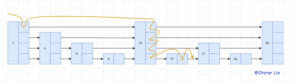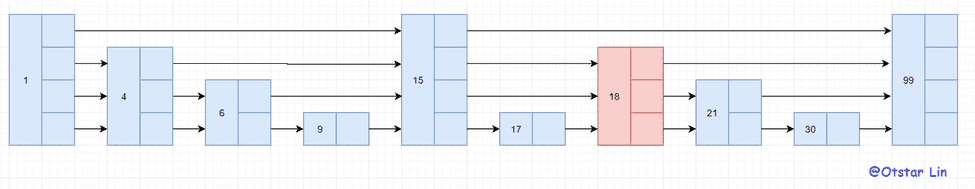 上面所说的结构是静态的,当我们向上方的跳表中不断加入数据,如果不更新索引就有可能出现某节点之间出现大量节点的情况,在极端的情况下还会退化成链表。而如果在插入的时候重建索引那势必会导致跳表的插入效率大幅下降。那要如何解决动态插入的问题呢?在红黑树和 AVL 树中是使用左右旋来平衡二叉树,而跳表同样也有一种机制来平衡:通过随机函数来是插入的节点的层高是随机的,不强制要求 1:2 的分区。如,我们要在以下的跳表中添加一个值为 18 的节点: