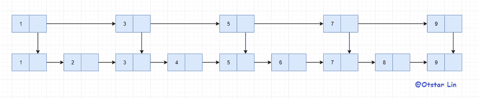 那么如何能提高查找效率呢?在 O(n)的时间复杂度下如果要提高运行效率,二分是必不可少的,树结构可以通过左右子树来分区,那链表又如何分区呢?建立索引,我们对这个链表加上一层索引。